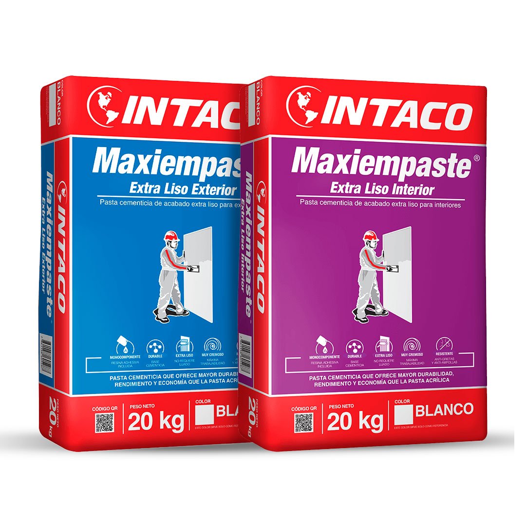 Maxiempaste Extra Liso Interior Empaste cementicio de gran trabajabilidad y durabilidad, modificado con polímeros y aditivos de alta calidad, especialmente formulado para dar un acabado extra liso en una capa delgada desde 0 mm hasta 2 mm de espesor sobre paredes en interiores. Maxiempaste Extra Liso Exterior Empaste cementicio de gran trabajabilidad y durabilidad, modificado con polímeros, hidrofugantes y aditivos de alta calidad, especialmente formulado para dar un acabado extra liso en una capa delgada desde 0 mm hasta 2 mm de espesor sobre paredes en exteriores.